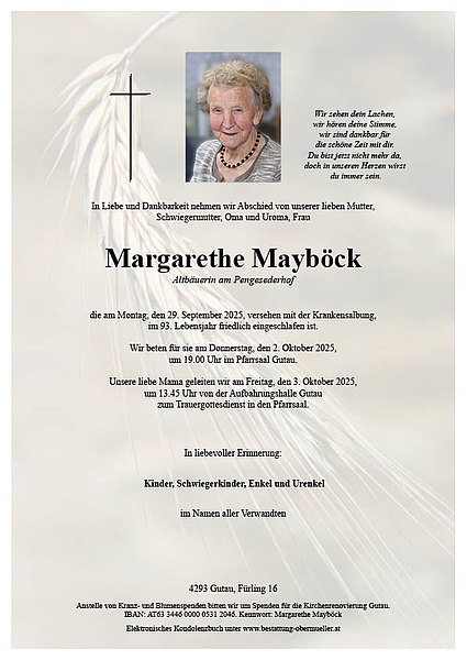 Das Begräbnis findet am Dienstag, am 22. April 2025 um 13.45 Uhr in der Pfarrkirche Gutau statt.